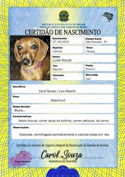 O documento também contém as informações do tutor, o que pode ser muito útil em diputas judiciais para a guarda do pet em casos de divórcio.