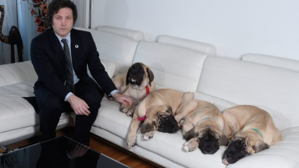O recém presidente eleito da Argentina, Javier Milei, tem algumas excentricidades, e dentre elas, está a relação com os seus cães que ele chama de “filhos de 4 patas” e o seu cachorro Conan, que falecido em 2017.