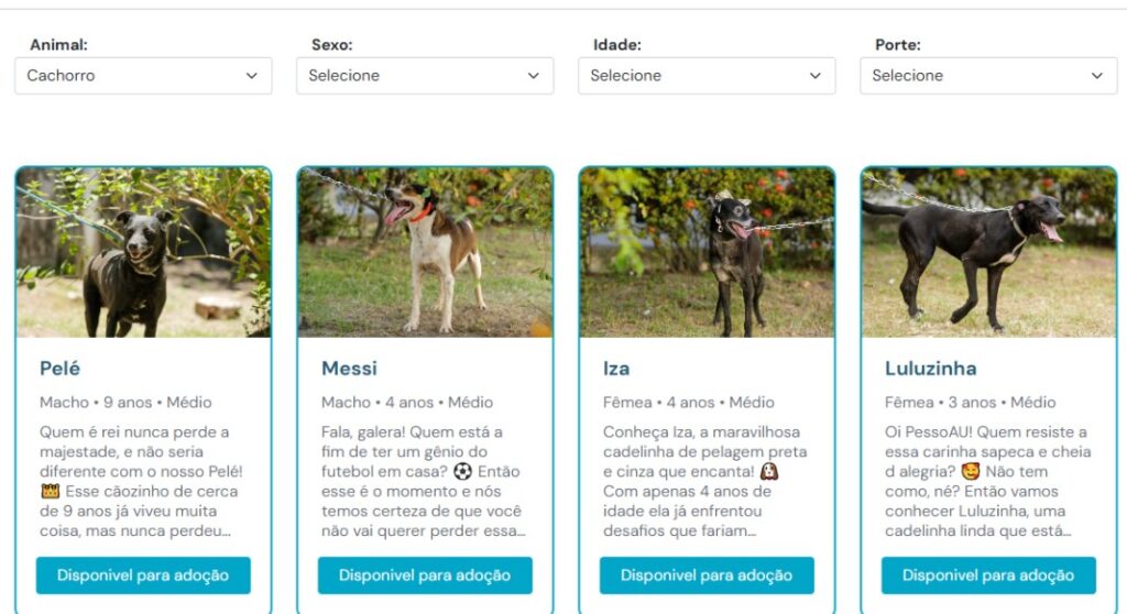 No site da prefeitura você encontra o projeto ADOTA PET. O objetivo é cadastrar as ONGs e os pets disponíveis e trabalhando em parceria com a prefeitura. As pessoas interessadas em adotar podem buscar de forma organizada e filtrando pelo tipo de pets que desejam, se cão, gato, pequeno ou grande porte.